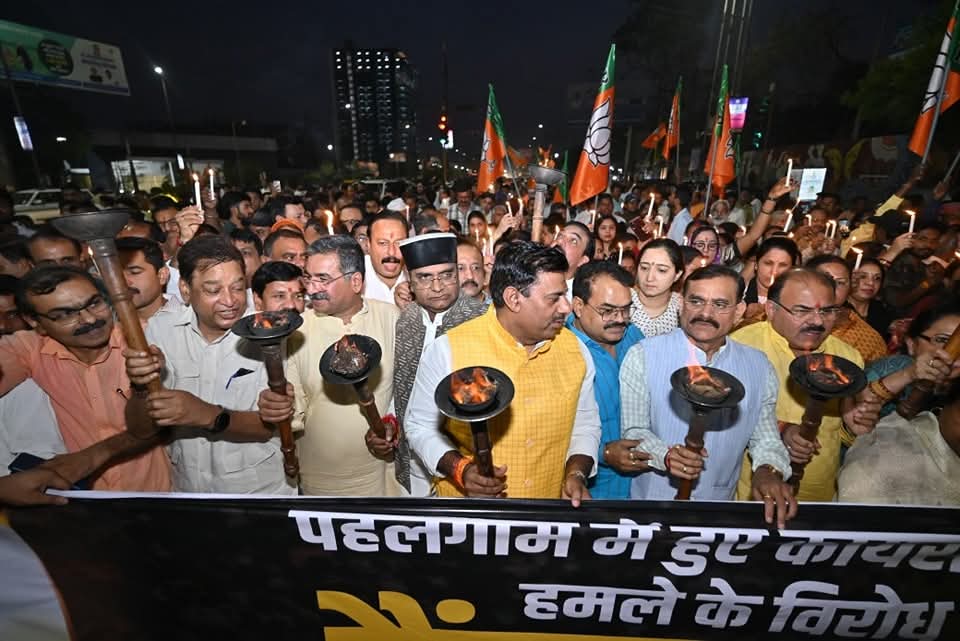 भाजपा प्रदेश अध्यक्ष, प्रदेश संगठन महामंत्री एवं जिलाध्यक्ष ने पहलगाम में हुए आतंकी हमले के विरोध में भोपाल में मशाल जुलूस निकालकर जताया विरोध