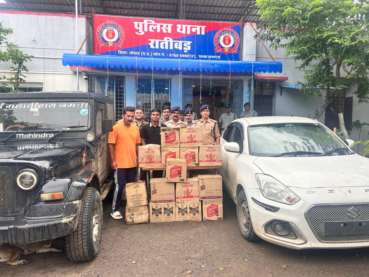 भोपाल। शहर में अवैध शराब के कारोबार पर बड़ी कार्रवाई करते हुए रातीबड़ पुलिस ने बुधवार रात स्टेट डेयरी के पास चेकिंग के दौरान दो कारों से अवैध शराब की बड़ी खेप जब्त की। पुलिस ने मौके से तीन आरोपियों को गिरफ्तार किया है। उनके कब्जे से करीब 135 लीटर अंग्रेजी शराब और दो लग्जरी गाड़ियां बरामद की गईं। जब्त संपत्ति का कुल मूल्य लगभग 15 लाख रुपये बताया जा रहा है।