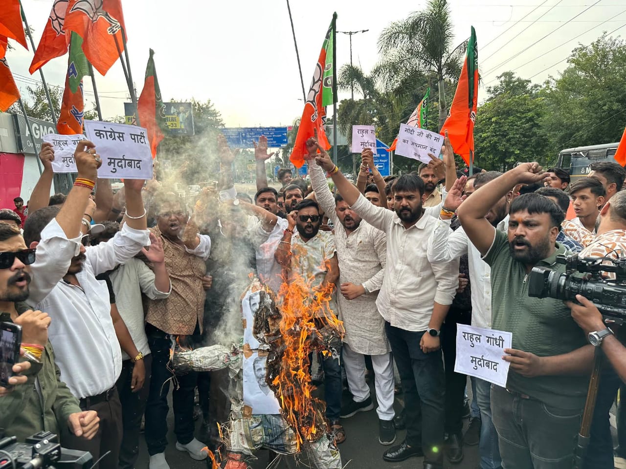 भोपाल। भारतीय जनता युवा मोर्चा के भोपाल जिला अध्यक्ष अजय पाटीदार के नेतृत्व में सोमवार को कांग्रेस कार्यालय के सामने राहुल गांधी और कांग्रेस का पुतला जलाया गया। इस दौरान बड़ी संख्या में युवा मोर्चा कार्यकर्ता शामिल हुए और जमकर विरोध प्रदर्शन किया।