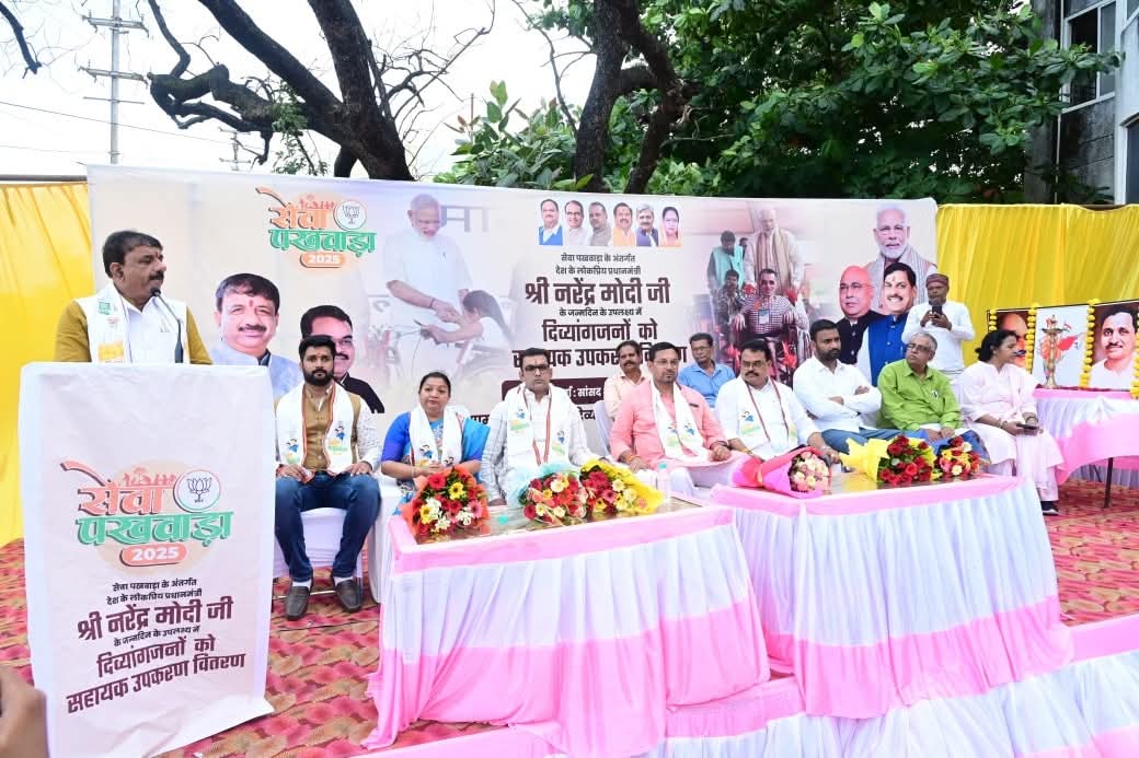 भोपाल। प्रधानमंत्री नरेंद्र मोदी के जन्मदिवस से लेकर 2 अक्टूबर तक मनाए जा रहे सेवा पखवाड़े के अंतर्गत शनिवार को स्पर्श भवन में दिव्यांगजन कल्याण कार्यक्रम का आयोजन किया गया। इस अवसर पर भाजपा प्रदेश उपाध्यक्ष एवं सांसद आलोक शर्मा तथा भोपाल जिला अध्यक्ष रविन्द्र यति ने 101 दिव्यांगजनों को उपकरण वितरित किए।