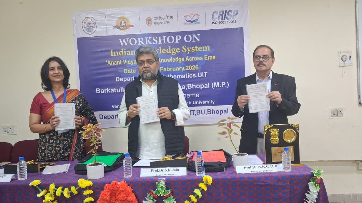 भोपाल। यूआईटी, बरकतउल्लाह विश्वविद्यालय, भोपाल के गणित विभाग द्वारा पीएम-यूषा योजना के अंतर्गत “भारतीय ज्ञान प्रणाली – Infinite Knowledge Across Eras” विषय पर आयोजित दो दिवसीय कार्यशाला (10-11 फरवरी 2026) सफलतापूर्वक संपन्न हुई। कार्यशाला में विभिन्न विषयों से लगभग 125 प्रतिभागियों, जिनमें मुख्यतः फैकल्टी सदस्य, पीएचडी शोधार्थी एवं स्नातकोत्तर छात्र शामिल थे, ने सहभागिता की।
